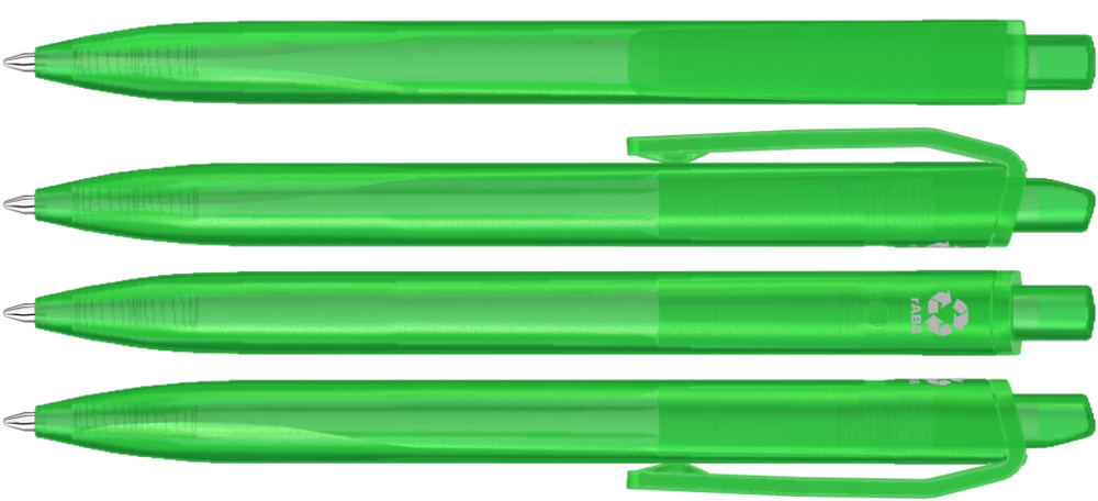 Druckkugelscheiber mit transparent gefrostetem Gehäuse, Clip und Drücker aus recyceltem ABS Kunststoff. Griffzone ergonomisch geformt.