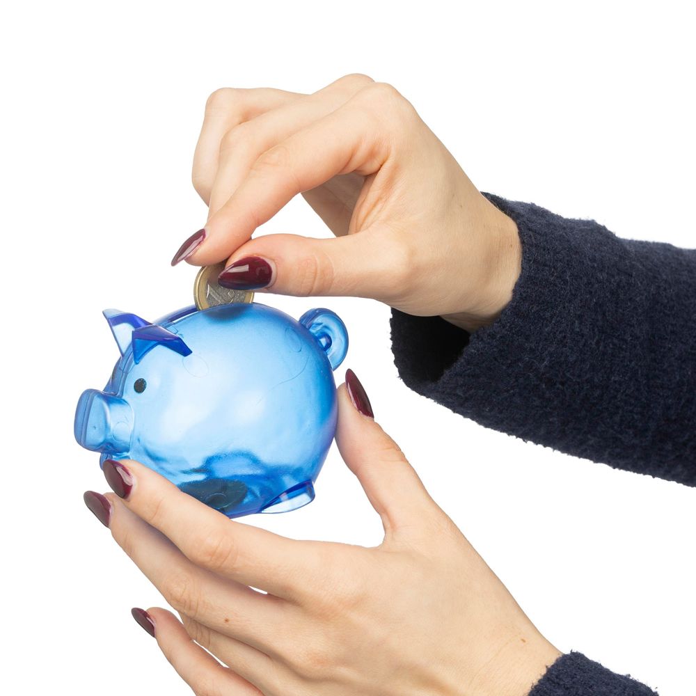Sparschwein aus recyceltem PS-Kunststoff gefertigt. Es ist transparent und trägt auf der... mehr