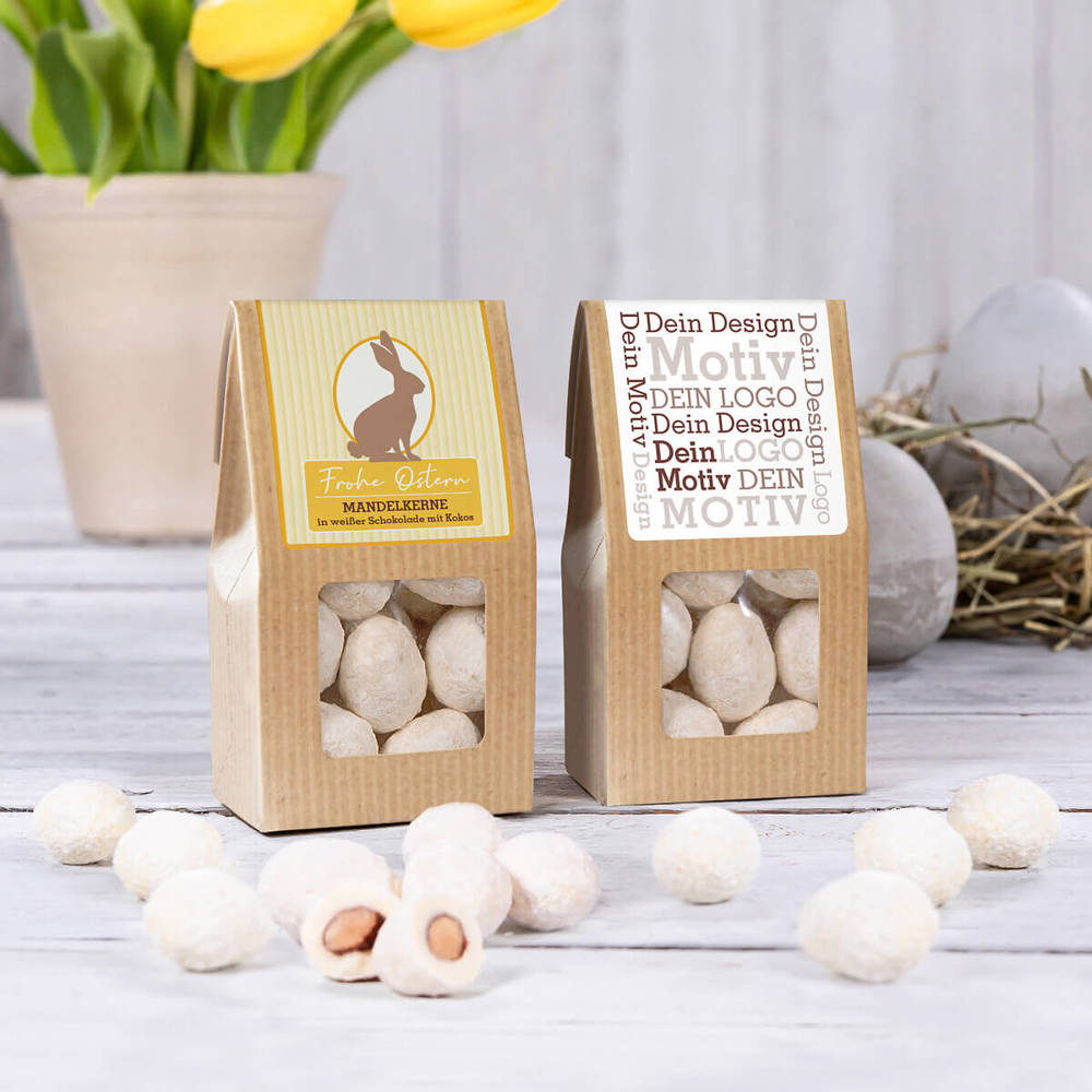 Ab 500 Stück mit Ihrem Motiv im 4c Druck auf dem Etikett der Faltschachtel, ab 2.500 Stück vollflächig bedruckt im Offsetdruck: Der aufmerksamkeitsstarke Bestseller. Die Faltschachtel als nachhaltiges Premium-Giveaway. Hier kommt ein Kokos Snack in der perfekten Mini-Osterei-Form. Und einem Geschmack, der perfekt die Süße der weißen Schokolade, die Aromatik der Kokosflocken und die herbe Mandelnote verbindet. Sie suchen eine andere Größe? Dieses Premium Präsent ist auch als Faltschachtel und Maxi Faltschachtel erhältlich.