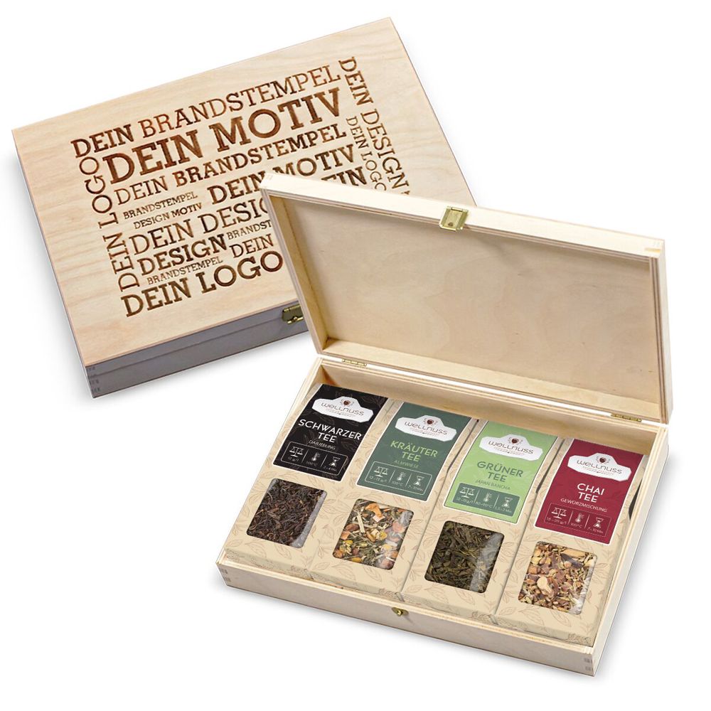 Ab 50 Stück mit Ihrem Branddruck auf dem Deckel der Birkenholzbox: Ein Geschenk liebevoll und nachhaltig zu verpacken, bereitet Freude. Deshalb lassen wir unsere Premium Präsentboxen in einem Familienbetrieb von Hand fertigen und Ihr Logo in den Deckel einbrennen. So entsteht ein Premium Präsent mit Langzeit-Werbeeffekt. Wählen Sie aus folgenden Tee Spezialitäten: Schwarzer Tee Darjeeling, Grüner Tee Japan Bancha, Kräutertee Almwiese oder Chai Gewürzmischung Sie suchen eine andere Größe? Dieses Premium Präsent ist auch mit 2, 3 oder 8 Snacks erhältlich.
