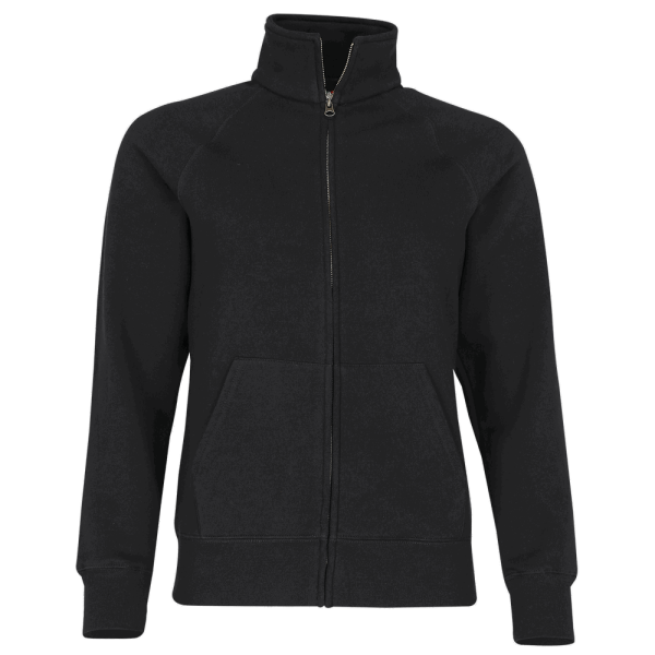 Premium-Sweatjacke für Damen von Fruit of the Loom mit zwei aufgesetzten Taschen und verdecktem Reißverschluss. Stehkragen mit Single-Jersey-Nackenband und Bündchen aus Baumwolle/Elastan-Ripp sorgen für angenehmen Tragekomfort. Seitennähte definieren eine feminine Passform.
