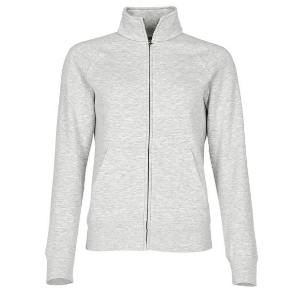 Premium-Sweatjacke für Damen von Fruit of the Loom mit zwei aufgesetzten Taschen und verdecktem Reißverschluss. Stehkragen mit Single-Jersey-Nackenband und Bündchen aus Baumwolle/Elastan-Ripp sorgen für angenehmen Tragekomfort. Seitennähte definieren eine feminine Passform.