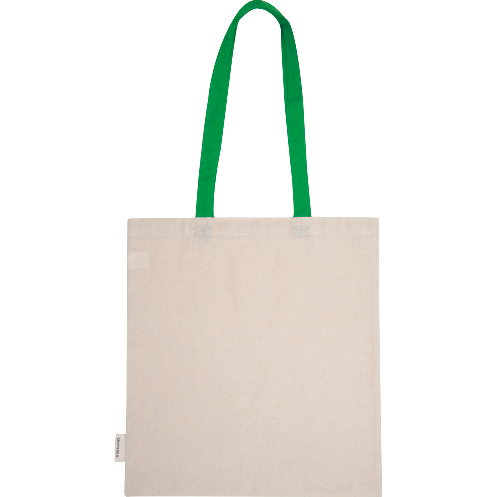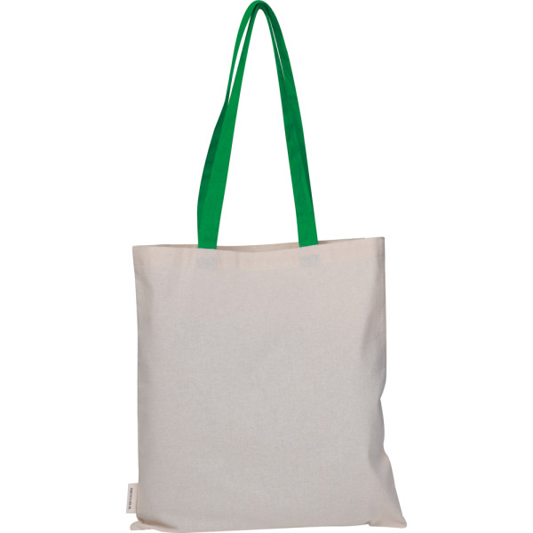 Baumwolltasche mit zwei langen Henkel aus 75% recycelter Baumwolle und 25% recyceltem PET. Grammatur 140 gsm. Ihre Werbung bringen wir auf einer Seite der Tasche an.
