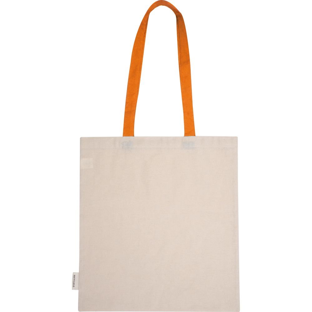 Baumwolltasche mit zwei langen Henkel aus 75% recycelter Baumwolle und 25% recyceltem PET. Grammatur 140 gsm. Ihre Werbung bringen wir auf einer Seite der Tasche an.
