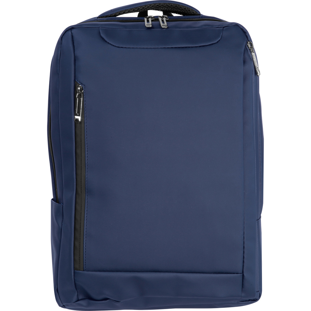 Laptoprucksack aus PU für 15-16 Inch Laptops. Er verfügt über zwei Reißverschlussvorfächer, ein großes Hauptfach mit Polsterung für den Laptop, diverse Einsteckfächer innen, gepolsterte Schultergurte, einen Tragegriff sowie einen Gurt auf der Rückseite zum Befestigen am Trolley. Ihre Werbung bringen wir am Vorfach an.