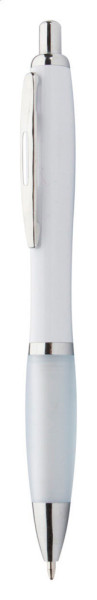 Kunststoff-Kugelschreiber mit weißem Schaft, farbiger Griffzone und verchromten Elementen, blauschreibend.