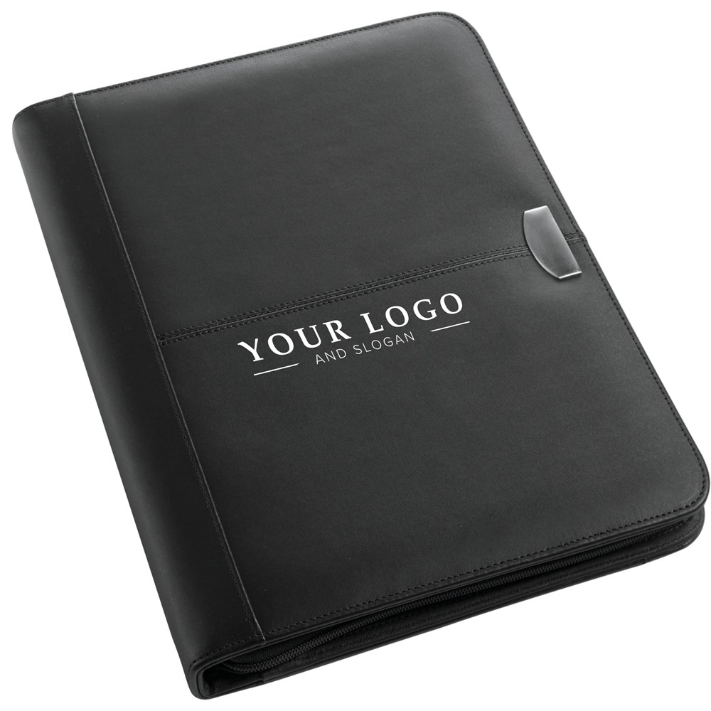 Dokumentenmappe aus Kunstleder, ca. DIN A4-Format, mit Reißverschluss, Stifthalter (ohne Stift), 8 Einsteckfächern, Schreibblock (liniert) und Metallplätchen für Gravuren.