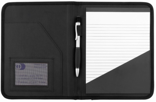 Preiswerte Schreibmappe aus gediegenem Material. DIN A5 Format, VPE 40. Papier- und Visitenkartenfach, Stiftschlaufe, Block