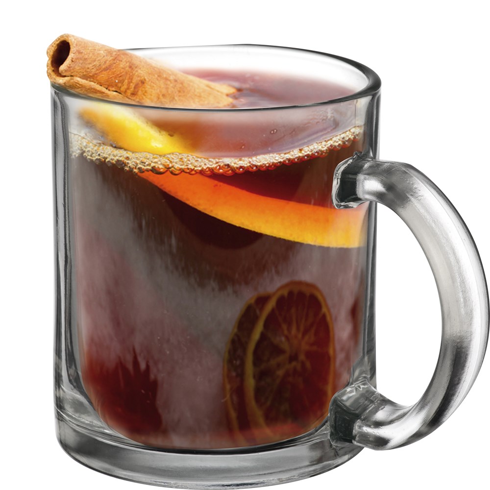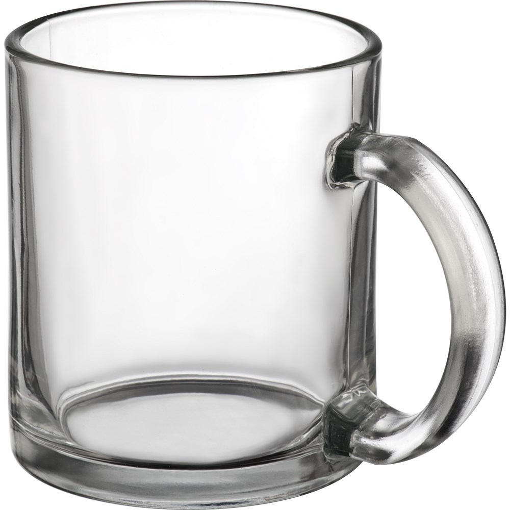 Elegante Tasse aus Glas in Humpenoptik (Fassungsvolumen 300 ml). Ihre Werbung drucken wir im Keramiktransfer an eine Position rechts oder links vom Henkel. Rundumdruck auf Anfrage.