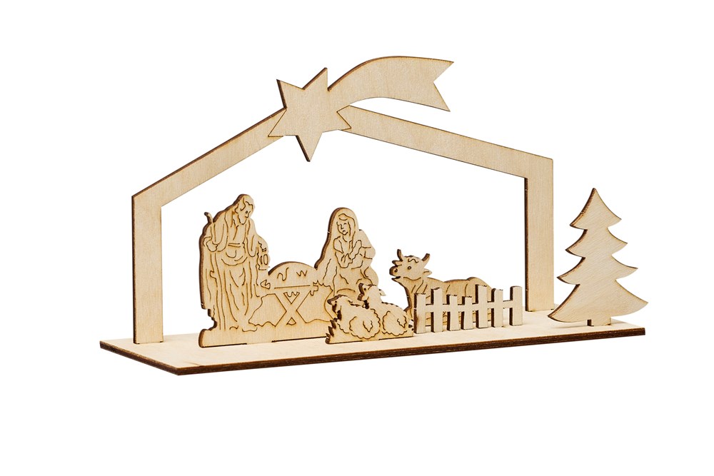 Stimmungsvoll gestaltete Krippe aus naturbelassenem Birkensperrholz, hergestellt in der EU. Bestehend aus 7 Einzelteilen zum zusammenstecken, inklusive Steckanleitung. Ideal auch als Mailingverstärker. Maße ca. 18 x 6,5 x 9,5cm. VE 170/1 Stück.