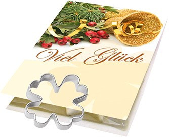 Ein nettes und nützliches Giveaway für die Adventszeit und zu Weihnachten. Dieses kleine Kärtchen beinhaltet eine Kleeblatt-Ausstechform, die jedes Jahr wieder verwendet werden kann. Ein passendes Rezept befindet sich auf der Rückseite der Karte. Platz für den Werbedruck ist auf dem Standardmotiv der Karte oder eine eigene Gestaltung des Kärtchens, jeweils bereits ab 250 Stück.
