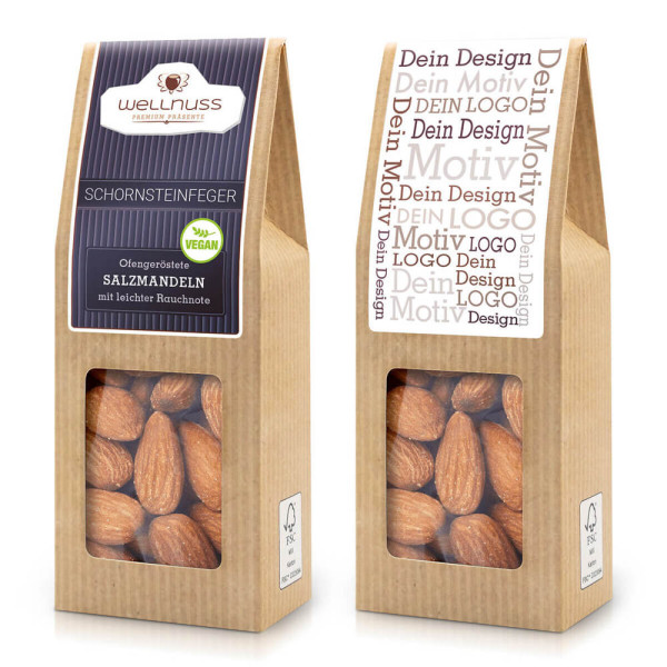 Ab 250 Stück mit Ihrem Motiv im 4c Druck auf dem Etikett der Faltschachtel, ab 2.500 Stück bedrucken wir den Faltschachtelkarton vollflächig: Der aufmerksamkeitsstarke Bestseller. Die Faltschachtel als nachhaltiges Premium-Giveaway. Diese Mandel wird mit einer Prise geräucherten Salzes veredelt. Und zwar genau so viel, dass dem herb-süßen Eigengeschmack der ungehäuteten Mandelkerne nichts genommen, sondern eine zusätzliche, unvergleichliche Nuance verliehen wird. Diese Snack-Komposition ist vegan, laktosefrei und glutenfrei.