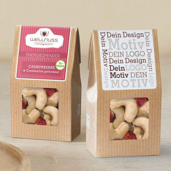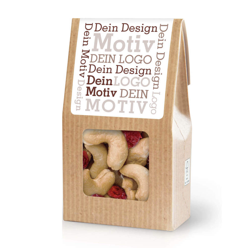 Ab 500 Stück mit Ihrem Motiv im 4c Druck auf dem Etikett der Faltschachtel, ab 2.500 Stück vollflächig bedruckt im Offsetdruck: Unser aufmerksamkeitsstarker Bestseller. Die Mini-Faltschachtel als nachhaltiges Premium-Giveaway. Süßliche Cashews spielen mit der leichten Säure schonend getrockneter Cranberries. Dieser Artikel ist vegan, laktosefrei und glutenfrei.