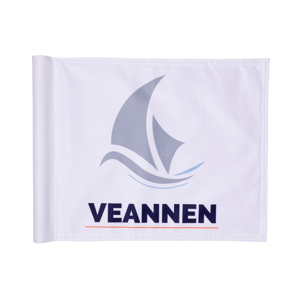 Ganzflächig bedruckte Lochfahne aus Polyester mit Kunststoffrohr für einefache Befestigung, Format 40 x 31 cm