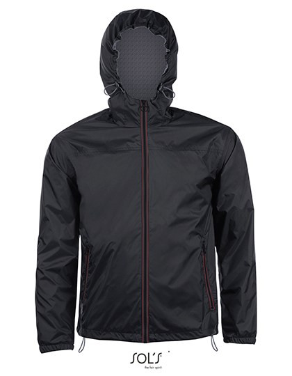 Reißverschluss in Kontrastfarbe | Seitliche Taschen | Klettverschluss-Öffnung unten an der Rückseite, um Veredelung zu erleichtern | Außenmaterial: 100% wasserabweisendes Nylon 210T | Futter: 100% Polyester-Mesh | Bei Farbe Black/Red ist die Kapuze Grey